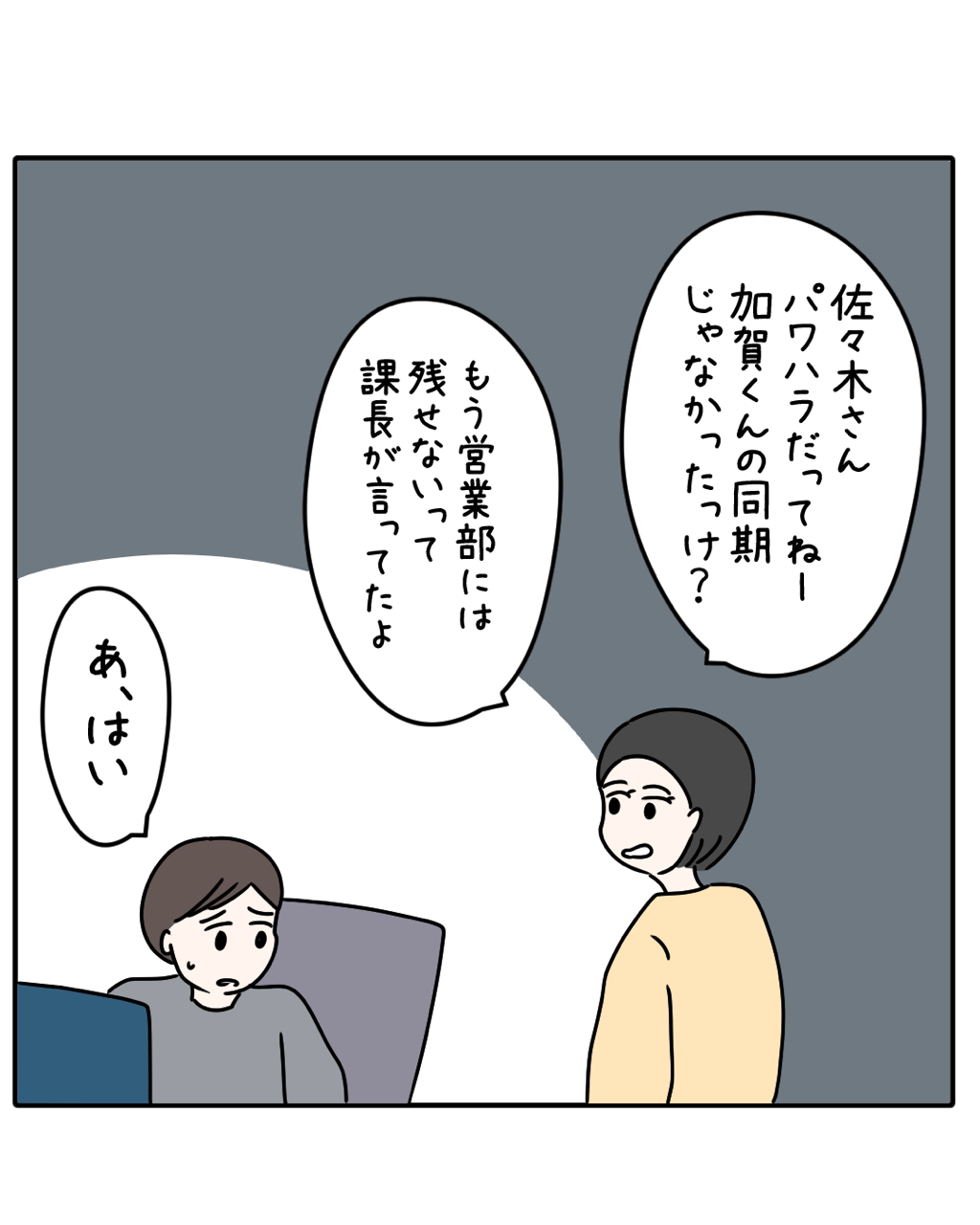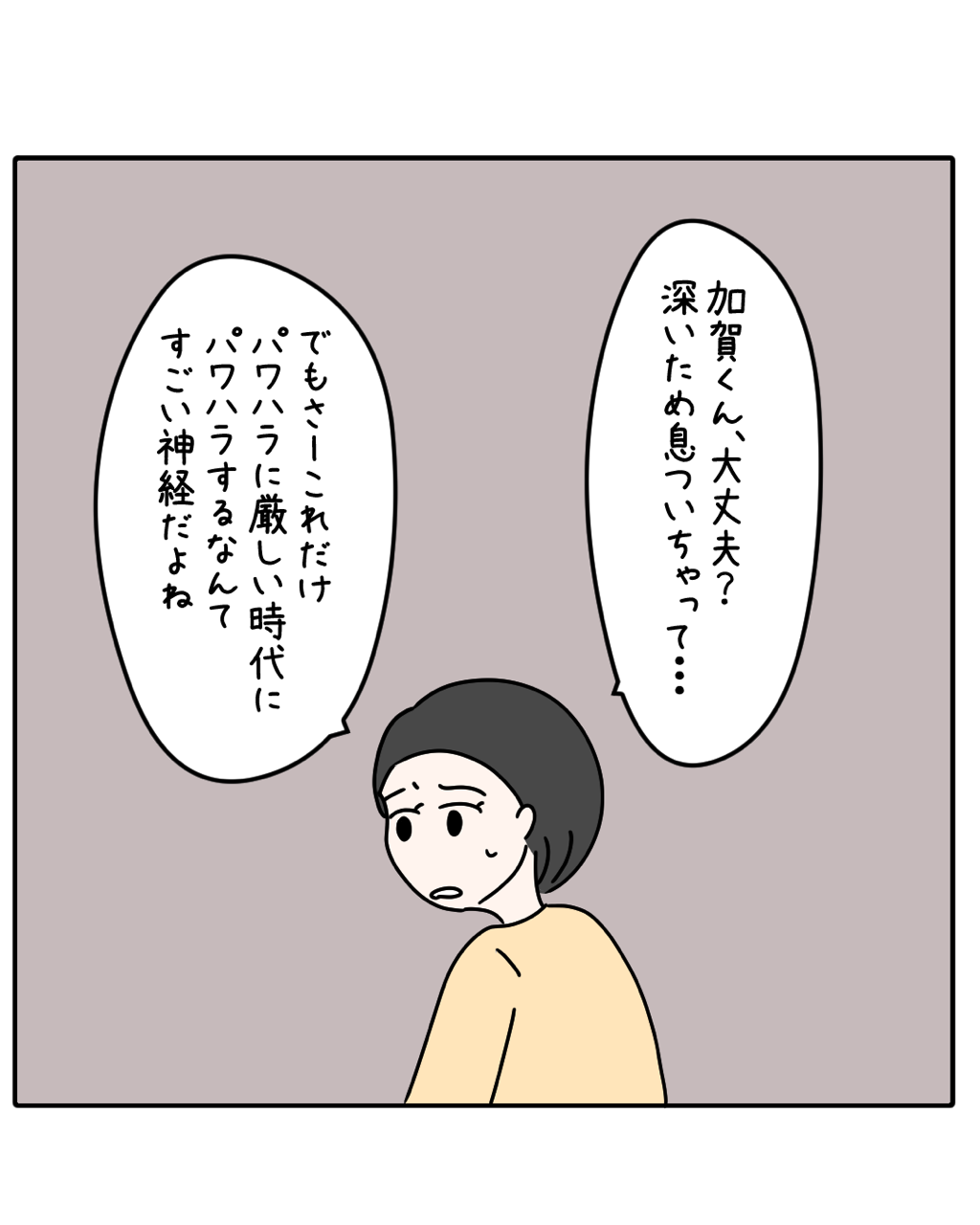 若い人たちは、注意されることを知らないから、注意されたら全てパワハラに変換していっちゃうんだろうよ…。まぁ、川田の場合は加賀くんと付き合ったえりさんへのただの腹いせだろうけど…。